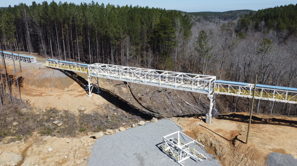 NAFCO is nearing completion of steel shipments to the field for all ground frame modules and over 4 miles of shop-assembled trusses. On-site assembly is well underway, and key segments of the conveyor structure are being successfully erected across the Alabama landscape. This marks a critical phase in the project, as the system begins to take physical shape and demonstrate the scale and precision of our efforts.